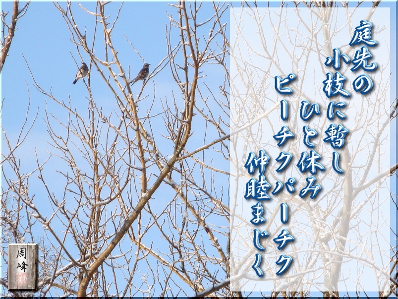 久しぶりの陽気に誘われて、庭先の小枝に「タヒバリ」の番いだろうか、ピーチクパーチクと会話している。「俺はあっちに行くぞ、いや私はこっち」とでも話しているのだろうか。仲良さそうな2羽のタヒバリだった。 |