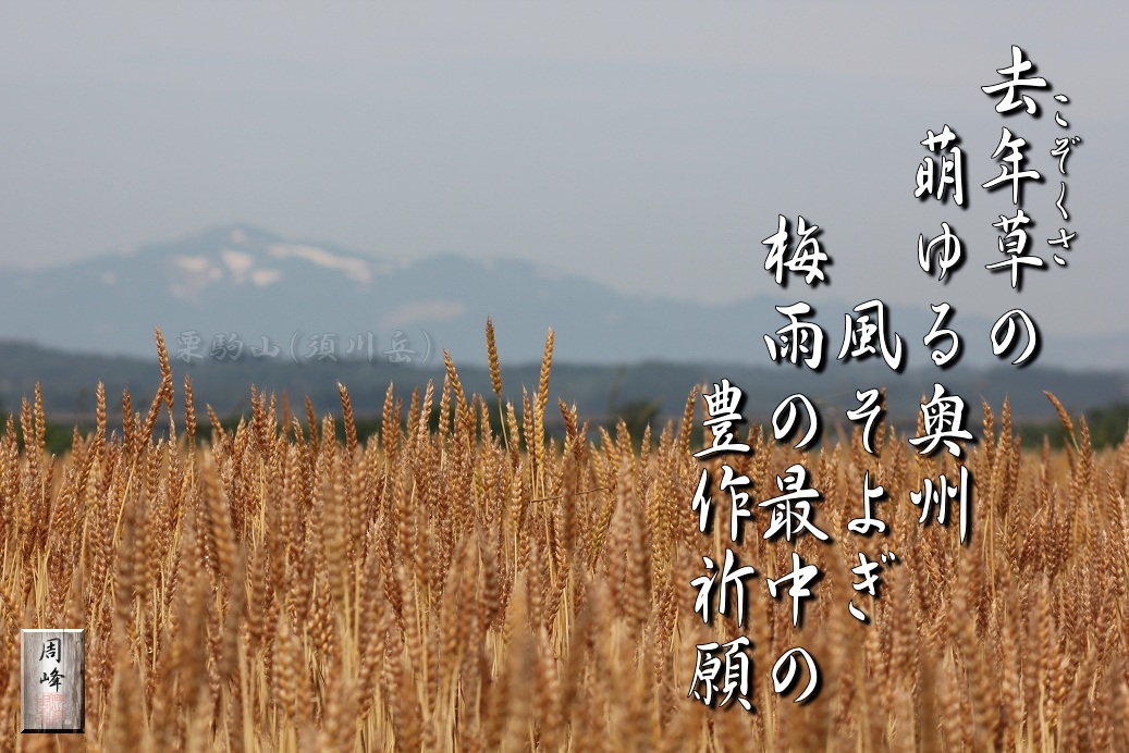 去年草(こぞくさ)とは、二年草である小麦(イネ科穀物)などの異称。昔は我家でも栽培していたが、収穫時に抜け落ちるイガイガが今でも忘れられない。奥州陸奥も今が収穫時期となる。 |
