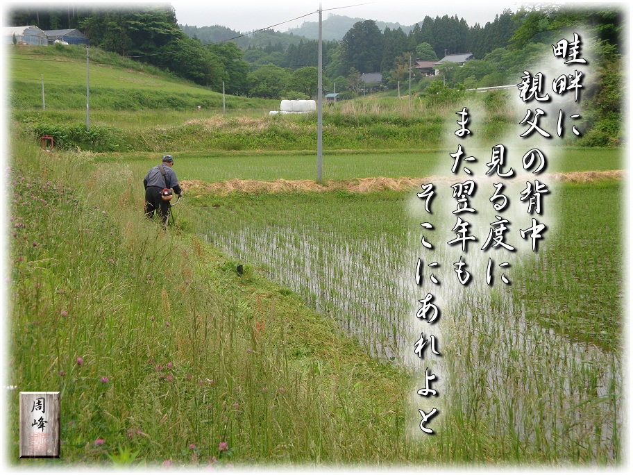膝の悪い親父に、「やらなくてもいいよ」と言ってるにも係わらず、足を引きずりながらも草刈り機械を背負っている。 息子一人にやらせるのは、忍びないと思ってのことだろう。 ビッこを引きながらの草刈り作業なので、それなりの仕事量だが、そこに居るだけでも心強くもあり、実に有難いものである。 続きを読む>> |