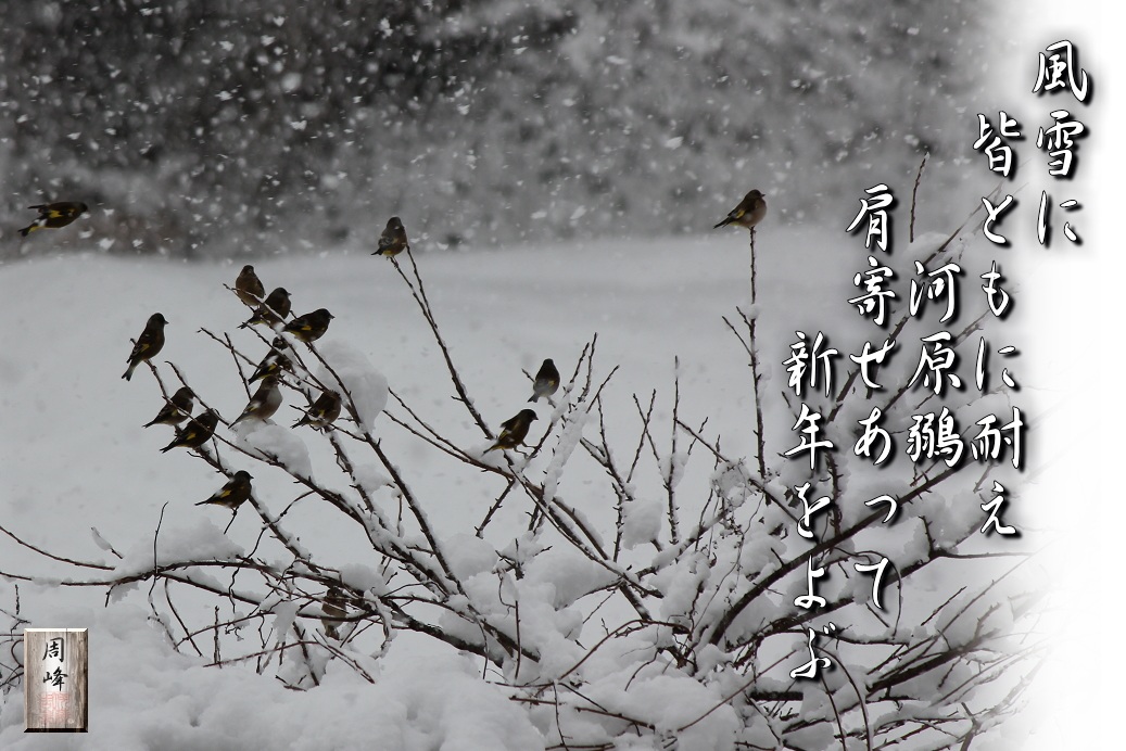 強風をともなう豪雪の中、河原鶸(カワラヒワ)の家族か或いは仲間だろうか居場所を求めて彷徨っていた。猛吹雪に向って果敢に挑むその姿は、勇猛果敢でもあった。 仲間の絆、家族の絆、「皆と共に歩めば何も怖いものなど無いのだ」と言っているかの様でもあった。今年もその絆を大切にしていきたいと希う、昨日大晦日に撮った写真の一枚だった。 |