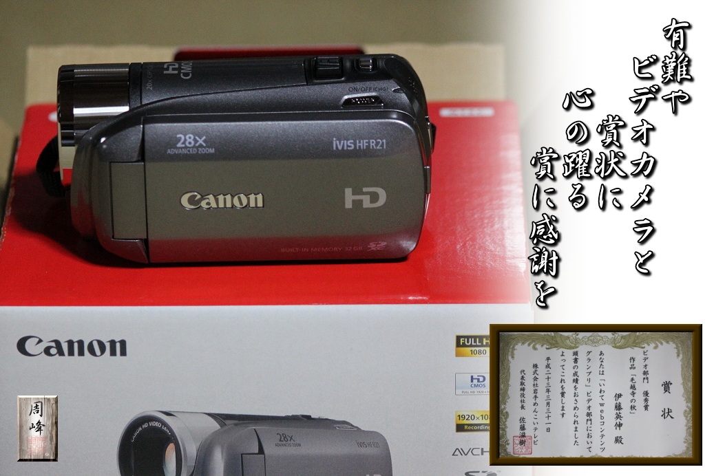 昨夜自宅に戻ってみると、テーブルの上に私宛の小包が届いていた。「何かな」と早速開けてみると、中には賞状とビデオカメラが入っていた。差出人は「めんこいエンタープライズ」とあり、直ぐに合点がいった。本来であれば、3月中に表彰式の予定だったが、3・11東日本大震災により中止となった。その為、部門賞受賞者には賞状と賞品が送られたものだが、私はそのうちのビデオ部門賞を受賞していた 続きを読む>> |