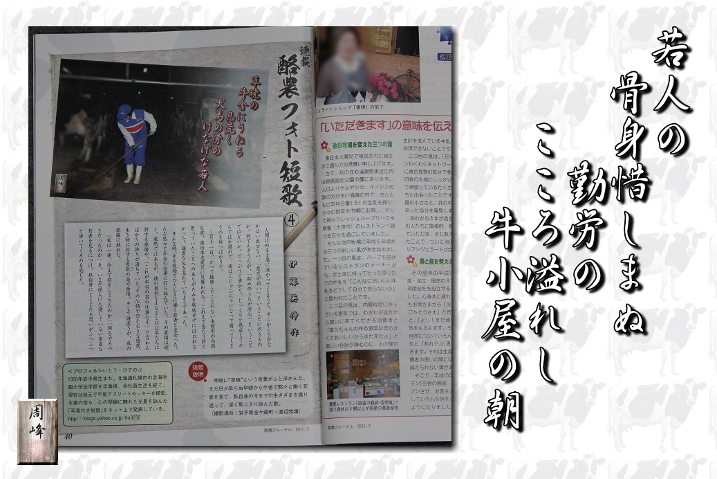 今月の月刊「酪農ジャーナル」7月号に、新連載酪農フォト短歌「犬馬の労」が掲載された。 草(早)暁の 牛舎にうねる 息荒く 犬馬の労の けなげな若人 十代の寡黙な若人が、牛舎の中でもくもくと、しかも真面目に働く姿を見て、「俺は今迄いったい何をやってきたのか」。 続きを読む>> |