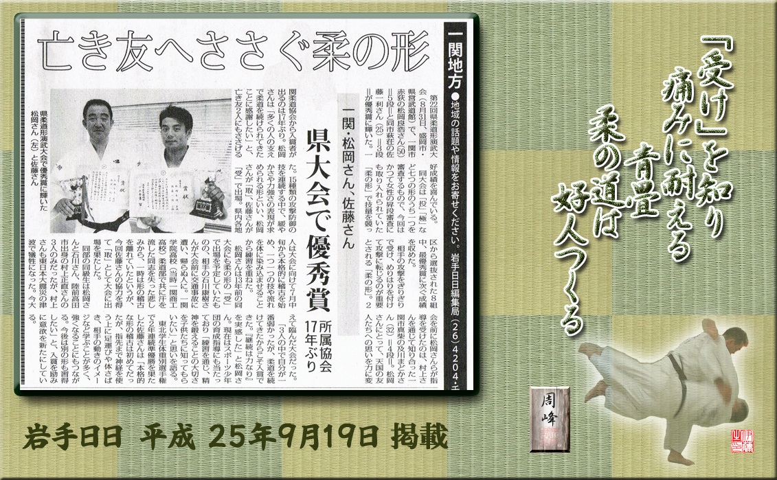 先日の地元紙の朝刊で、「亡き友へささぐ柔の形」というタイトルが目に止まった。 8月31日に行われた第22回岩手県柔道形演武大会に於いて、地元一関市赤萩在住の松岡良浩(一関柔道協会理事長・50才)五段と同市萩荘の佐藤一利(25才)二段の両名が、優秀賞に輝いたとのことだった。今から10数年前、松岡氏の学生らいの友であり良きライバルでもあった石川康樹(故)氏と、同演武大会に出場する 続きを読む>> |