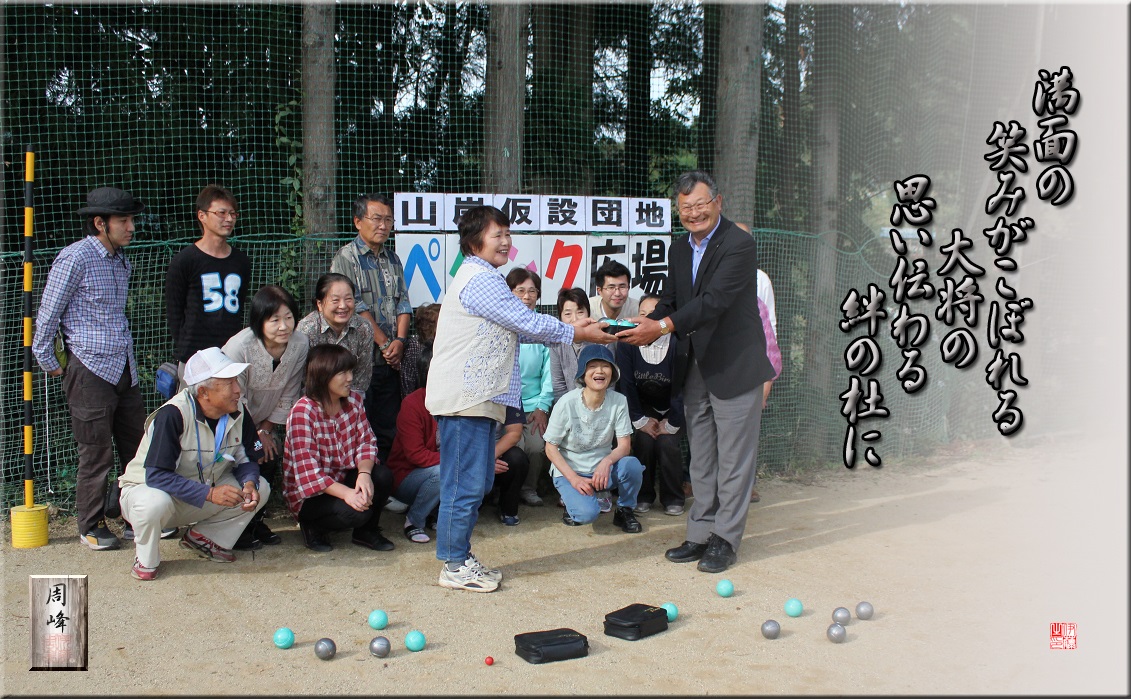 今日の地元紙(岩手日日新聞)の朝刊に、先週の金曜日(10月4日)に行われた大船渡市末崎町内の仮設団地で、高橋静雄(北上市在住69才)さんが寄贈したペタンクの贈呈式の記事(本多秀行記者)、第2段が載っていた。 写真には、贈呈後に行われた競技(練習)の模様が載っており、真剣に、しかも楽しそうな表情が見て取れ、実に微笑ましい光景だった。 続きを読む>> |