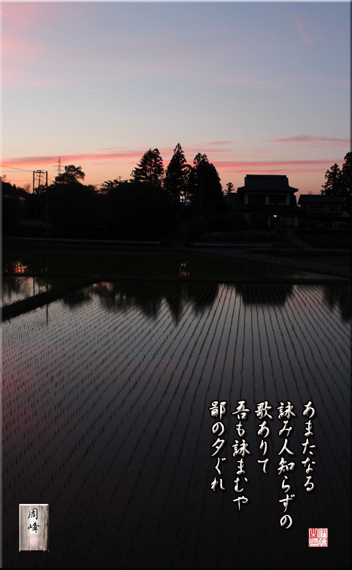 無事に我が家の田植えが終わった。周り近所の田ん圃では、おおかた田植えが終わっている。若葉を讃える山並みがくっきりと映しだされる鏡田には、新緑色の苗が小風の波紋に揺らぎながらビニールハウスの狭く暑苦しい苗床から開放され、気持ち良さそうに規律正しく並んでいる。 後はすくすくと育ち、秋の収穫期には黄金色の稲穂がたわわに 続きを読む>> |