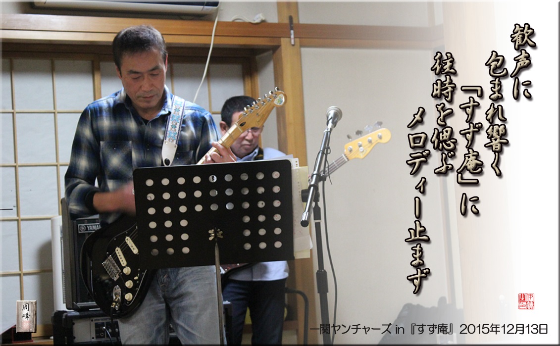 昨夜、一関市五代町の蕎麦屋、そば切り『すず庵』を会場に、おやじバンド『一関ヤンチャーズ』の今年最後のインストルメンタルライブが賑々しく開催された。新メンバーも加わり、懐かしのベンチャーズナンバーを柱に全27曲(アンコール曲含む)。オールディーズファンにはたまらないあっという間の2時間だった。 メンバーの同級生による即興の踊り(ダンス)や、第2ステージで 続きを読む>> |
