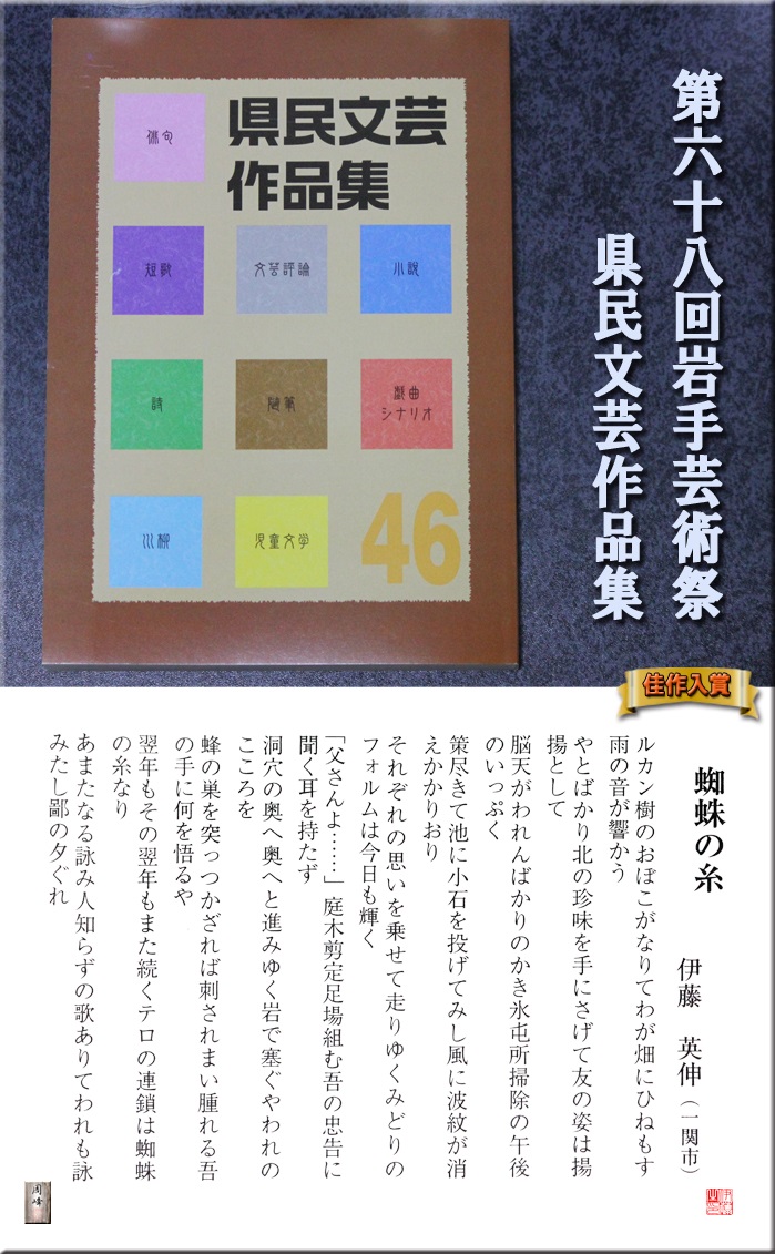 第68回岩手芸術祭県民文芸作品集が出来上がったとの知らせが届き、早速購入しに行った。昨年に続き2回目の応募の結果、昨年同様短歌部門で佳作入選を果たした。随筆部門は昨年同様落選と相成り、難しさを改めて痛感した。 今年の短歌応募作品での受賞は、第8回斎藤實・春子夫婦を偲ぶ等短歌大会 佳作入選、第44回全国短歌大会 佳作入選、そして今回の受賞。 続きを読む>> |
