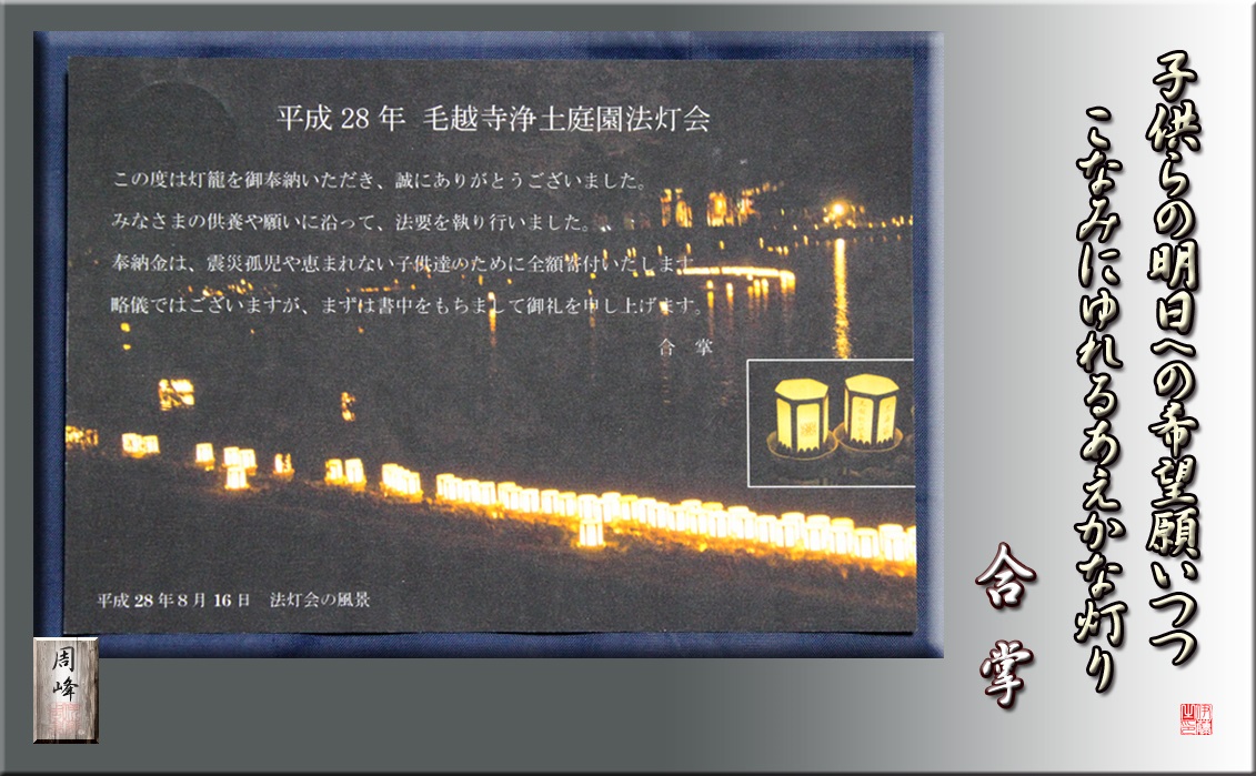 医王山毛越寺より、8月16日の毛越寺浄土庭園法灯会への灯籠奉納に、お礼の葉書が自宅に届いた。文面には法要の報告と奉納金の使途(震災孤児や恵まれない子供たちへ全額寄付)の報告が認められていた。 今回の法灯会には時間の折り合いが付かず、結局参拝及び参列は叶わなかった。返す返すも残念だ。 続きを読む>> |