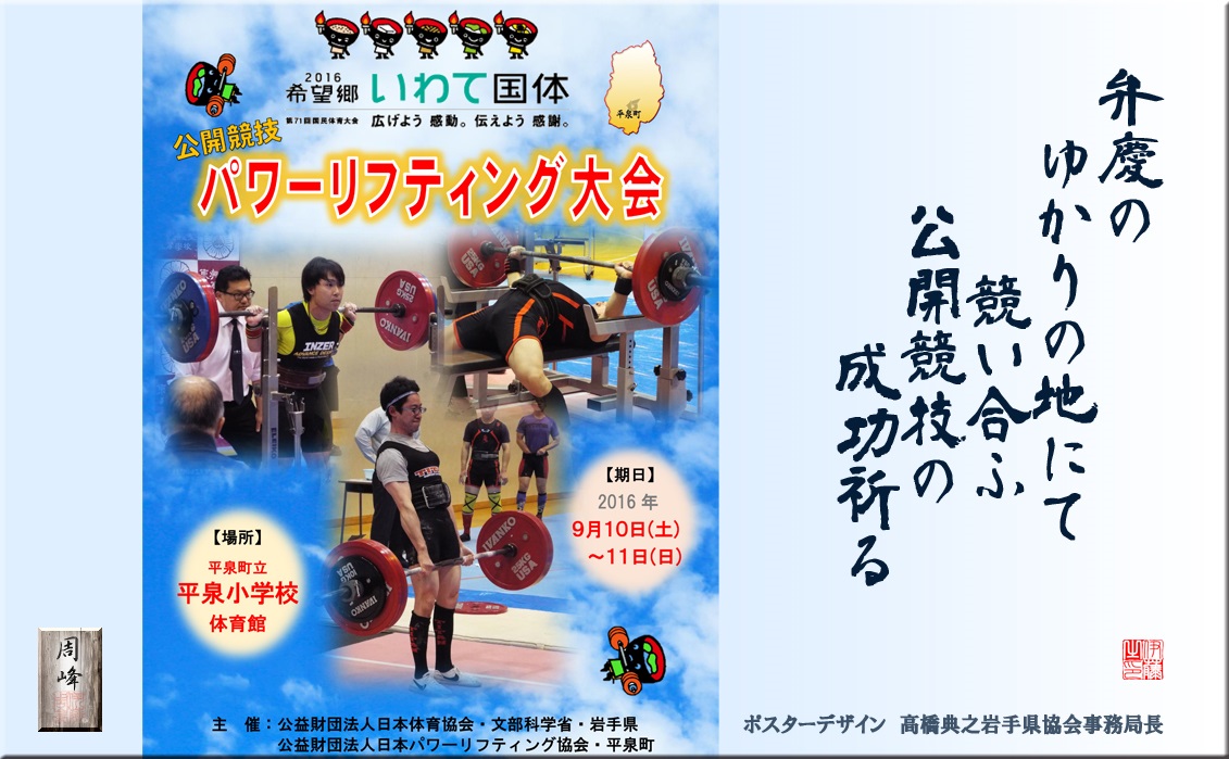いよいよ、希望郷いわて国体公開競技(パワーリフティング大会)が3日後に迫った。 思えば、今から8年前の2008年。元・日本パワーリフティング協会専務理事の東郷達男(故人)先生より、パワーリフティング競技が、2015年の和歌山国体から公開競技として位置づけられ、翌年の岩手国体は2回目となる。「非常に大事な大会になるので是非頑張ってほしい」「8年後とは云え、あっという間に時間は過ぎ 続きを読む>> |