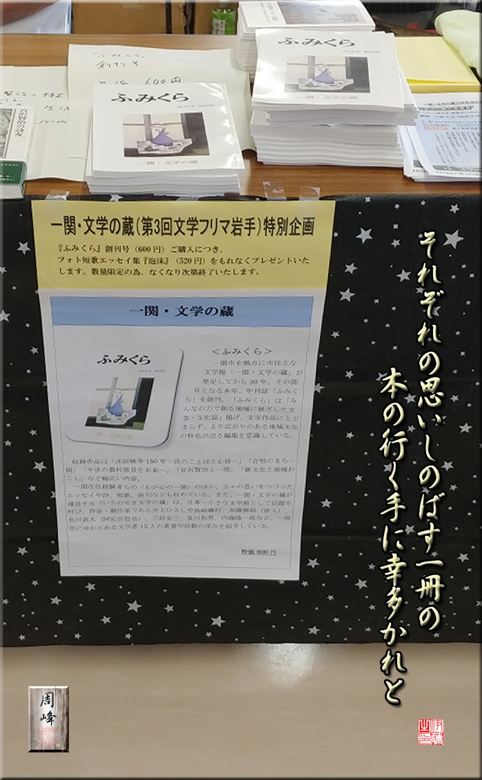 第3回文学フリマ岩手が終わった。と云っても、5日前の17日(日)に終わっているので、今更という気もしないではないが、一応来年の為の参考資料として記載しておきたい。遅れた理由として、先々週に行われた還暦同級会の記録動画の編集に手間取った、と云うのが主な理由だが、漸く無事に仕上がった。DVDには写真185枚と動画約28分を収めた。欲を云えばもう少し動画を増やそうかとも思ったが、 続きを読む>> |