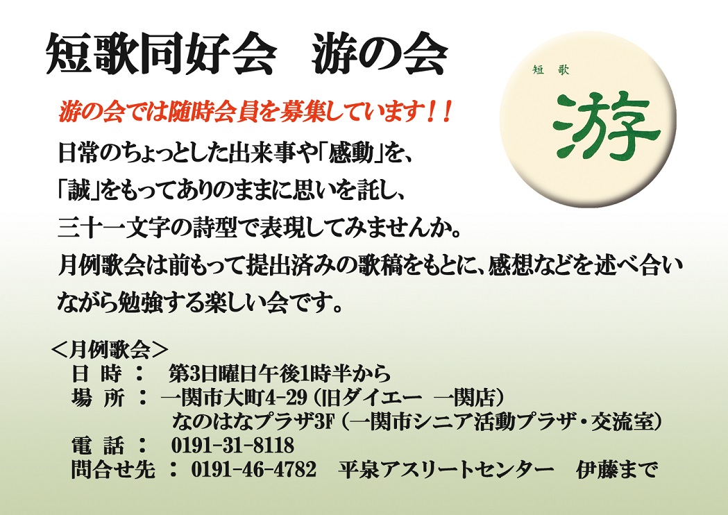 昨日、一関文化センターを会場に、4月29日開催の第40回西行祭短歌大会の打ち合わせが行われた。 一関近郊の歌会から代表者7名、主催者側の中尊寺から担当者2名、計9名の実行委員が集まり、前年度の会計報告から始まり、役割分担などを話し合った。 西行法師は、平安時代2度も平泉を訪れ、草庵を結び、 続きを読む>> |